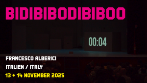 Regisseur, Autor und Schauspieler Francesco Alberici, *1988, zeichnet treffsicher und präzise ein Bild der westlichen Welt. Leichtfüßig – weil man darüber lacht, woran man leidet; mit Widerspruchsgeist, Ambition und Brüderlichkeit beschreibt Alberici ein System, das es durchgesetzt hat, den Wert des Menschen auf allen Ebenen an seiner „Performance“ zu messen. BIDIBIBODIBIBOO erhielt 2024 den italienischen Theaterpreis Ubu für den besten neuen Theatertext. Als Schauspieler und Autor arbeitete Alberici bereits mit verschiedenen italienischen Theaterformationen zusammen, darunter Deflorian / Tagliarini und Babilonia Teatri. 2021 erhielt er den Ubu als bester Schauspieler / Performer unter 35 Jahren. Mit Frigoproduzioni gründete er seine eigene Theatergruppe. BIDIBIBODIBIBOO ist seine vierte Regiearbeit.
