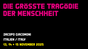 Jacopo Giacomoni, *1987, hat einen Abschluss in Philosophie und ist Theaterautor und Performer. 2025 gewann er mit seinem Stück TACET den Autorenwettbewerb der Biennale Teatro in Venedig. Seit 2013 ist er Teil des Theaterkollektivs Malmadur, was im norditalienischen Dialekt so viel wie „unreif “ bedeutet. Mit Malmadur arbeitet Giacomoni an neuen Versuchsanordnungen für ein Theater, das Darstellende und Publikum gleichermaßen ins Spiel bringt. DIE GRÖSSTE TRAGÖDIE DER MENSCHHEIT ist seine erste Regiearbeit.